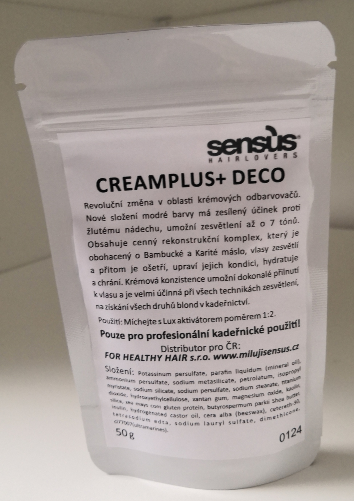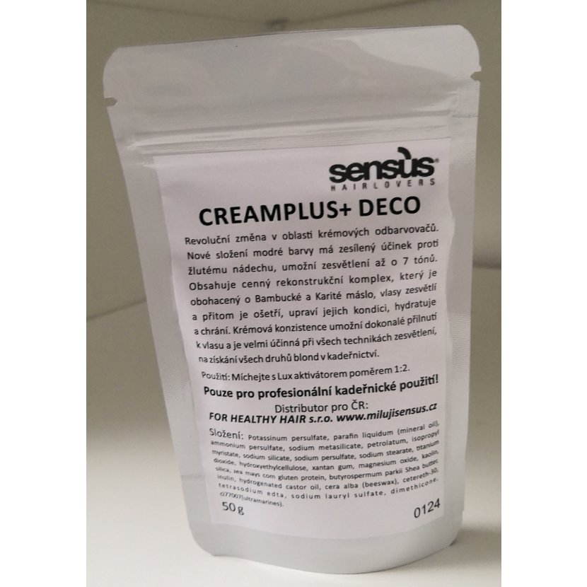 Sensus Inblonde Cream Black Deco je černý zesvětlovač krémového složení. Zesvětlení až o 7 tónů. Ideální pro velmi precizní techniky s potlačením nežádoucích tónů. S obsahem aktivního uhlí, meruňkového oleje a inulinu. Aktivní uhlí se získává z různých druhů dřeva například z břízy nebo vrby. Má výraznou absorpční a regenerační vlastnost. Meruňkový olej je známý především svými uklidňujícími, protizánětlivými, antiseptickými, hydratačními a zvláčňujícími vlastnostmi. Obsahuje vitamíny A a E. Vlasy jsou méně krepaté, silnější, zdravější a bez roztřepených konečků. Inulin má kondicionační, hydratační a uklidňující vlastnosti. Díky němu jsou vlasy hladší a snadněji se rozčesávají.