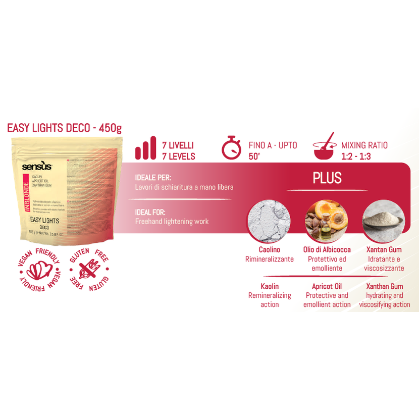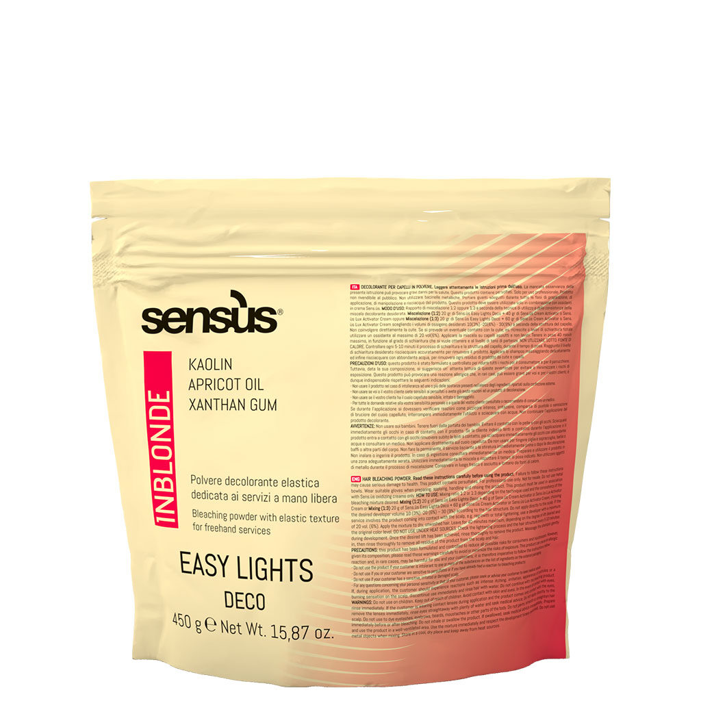 Sensus Inblonde Easy Lights Deco je bílý zesvětlující prášek. Zesvětlení až o 7 tónů. Ideální pro techniky volnou rukou pro kadeřníky, kteří chtějí vyjádřit svoji kreativitu. S obsahem kaolinu, meruňkového oleje a xantanové gumy. Kaolin neboli bílý jíl má jemný čistící účinek. Bílý jíl je ve skutečnosti schopen absorbovat přebytečný maz a nečistoty. Díky svému speciálnímu chemickému složení pomáhá kaolin k remineralizaci a detoxikaci výměnou minerálních solí za toxiny a nečistoty. Meruňkový olej je známý především svými uklidňujícími, protizánětlivými, antiseptickými, hydratačními a zvláčňujícími vlastnostmi. Obsahuje také vitamíny A a E. Vlasy jsou díky němu méně krepaté, silnější, zdravější a bez roztřepených konečků. Xantanová guma je přírodní zahušťovadlo a má hydratační vlastnosti. Je vhodný pro všechny typy vlasů. Dále funguje jako stabilizátor emulzí, kondicionér a zvlhčující látka.
