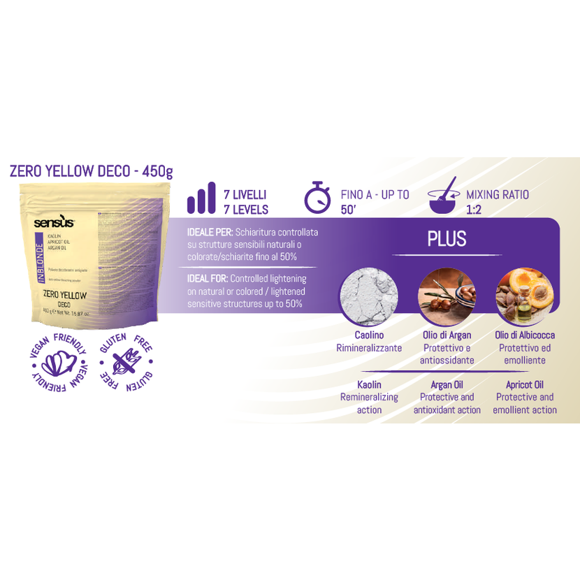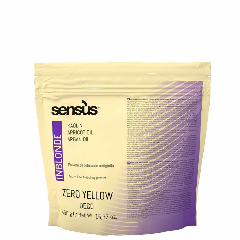 Sensus Inblonde Zero Yellow Deco je fialový zesvětlující prášek. Zesvětlení až o 7 tónů. Ideální pro přírodní nebo citlivé vlasy. S obsahem kaolinu, meruňkového oleje a arganového oleje. Zesvětlující prášek pro všechny techniky zesvětlení zejména pro vlasy se silným žlutým pigmentem. Kaolin neboli bílý jíl má jemný čistící účinek. Bílý jíl je ve skutečnosti schopen absorbovat přebytečný maz a nečistoty. Díky svému speciálnímu chemickému složení pomáhá kaolin k remineralizaci a detoxikaci výměnou minerálních solí za toxiny a nečistoty. Arganový olej se získává z plodů arganového stromu, bohatých na antioxidační látky jako je vitamín E, mastné kyseliny a flavonoidy. Zabraňuje stárnutí vlasů tím, že působí proti volným radikálům. Meruňkový olej je známý především svými uklidňujícími, protizánětlivými, antiseptickými, hydratačními a zvláčňujícími vlastnostmi. Obsahuje také vitamíny A a E. Vlasy jsou díky němu méně krepaté, silnější, zdravější a bez roztřepených konečků.