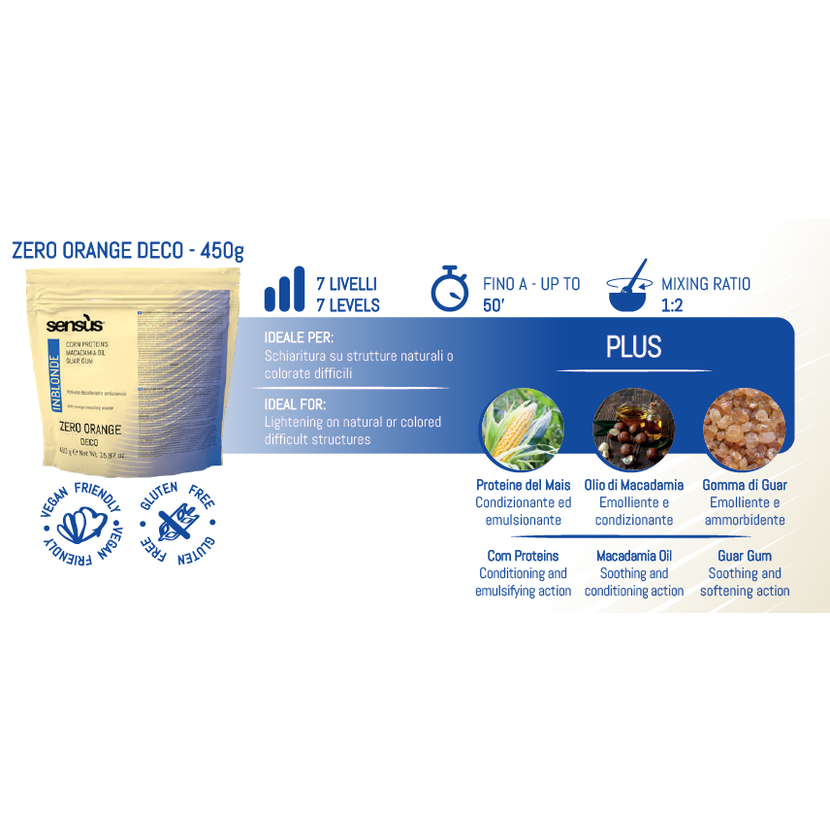 Sensus Inblonde Zero Orange Deco je modrý zesvětlující prášek. Zesvětlení až o 7 tónů. Ideální pro přírodní nebo barvené vlasy s obtížnou strukturou. S obsahem kukuřičného proteinu, makadamie a guarové gumy. Zesvětlující prášek pro všechny techniky zesvětlení, zejména pro vlasy se silným oranžovým pigmentem. Kukuřičné proteiny jsou složené z aminokyselin nezbytných pro zdraví vlasového vlákna (např. cystein, lysin, arginin). Hydratační a vyživující účinek pro úpravu a zjemnění vlasů, snižuje podráždění pokožky vlivem povrchově aktivních látek. Guarová guma pomáhá odstranit nežádoucí pigmenty. Zvláčňuje a zjemňuje vlasy a vlasovou pokožku, dodává hebkost a hydrataci, aniž by je zatěžoval. Makadamové ořechy mají vysoký obsah mononenasycených mastných kyselin, minerálů a vitamínů s vlastnostmi proti stárnutí a proti volným radikálům. Udržuje zdravé, silné a chráněné vlasy.
