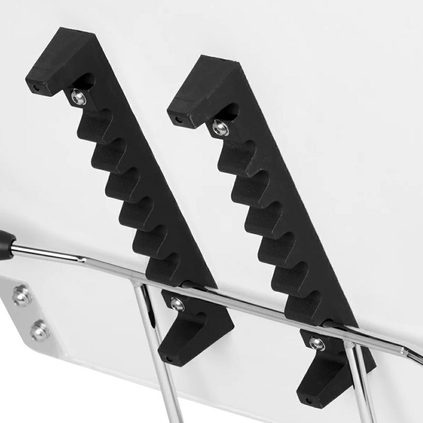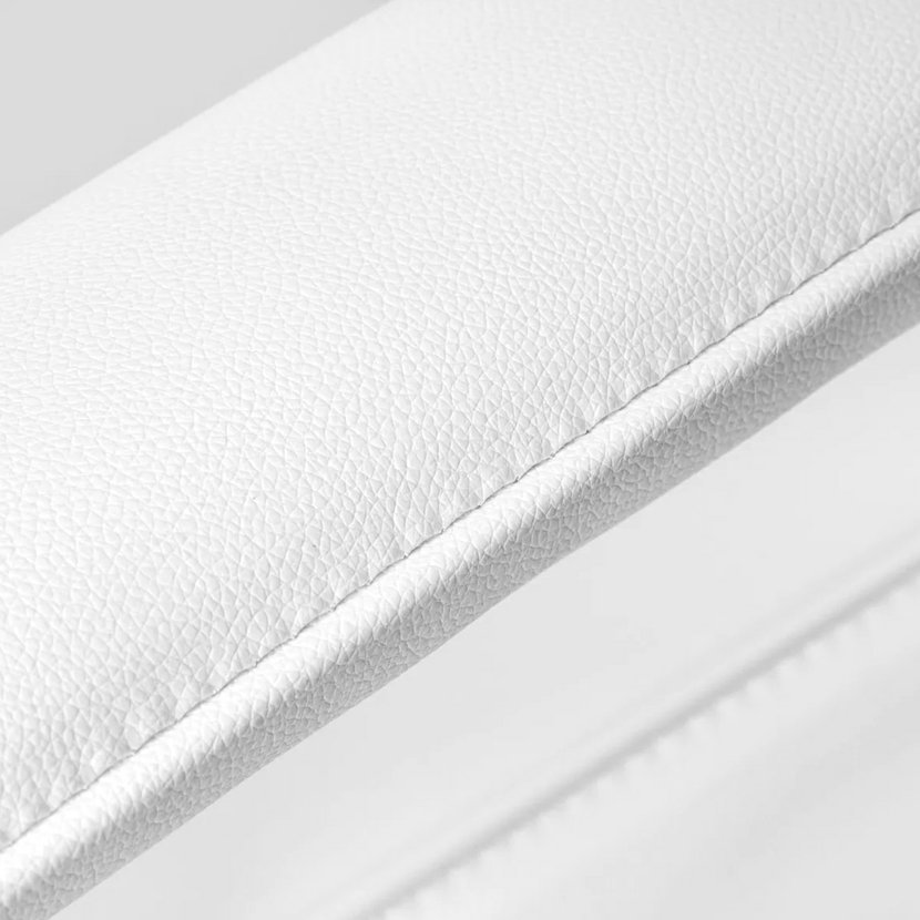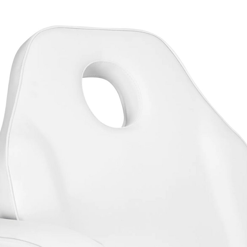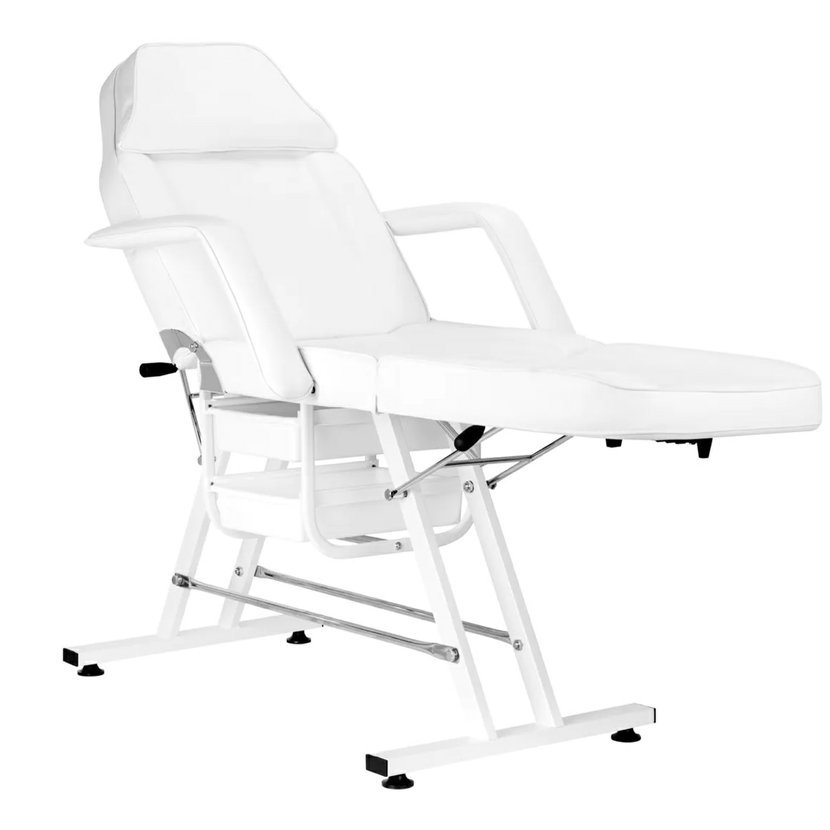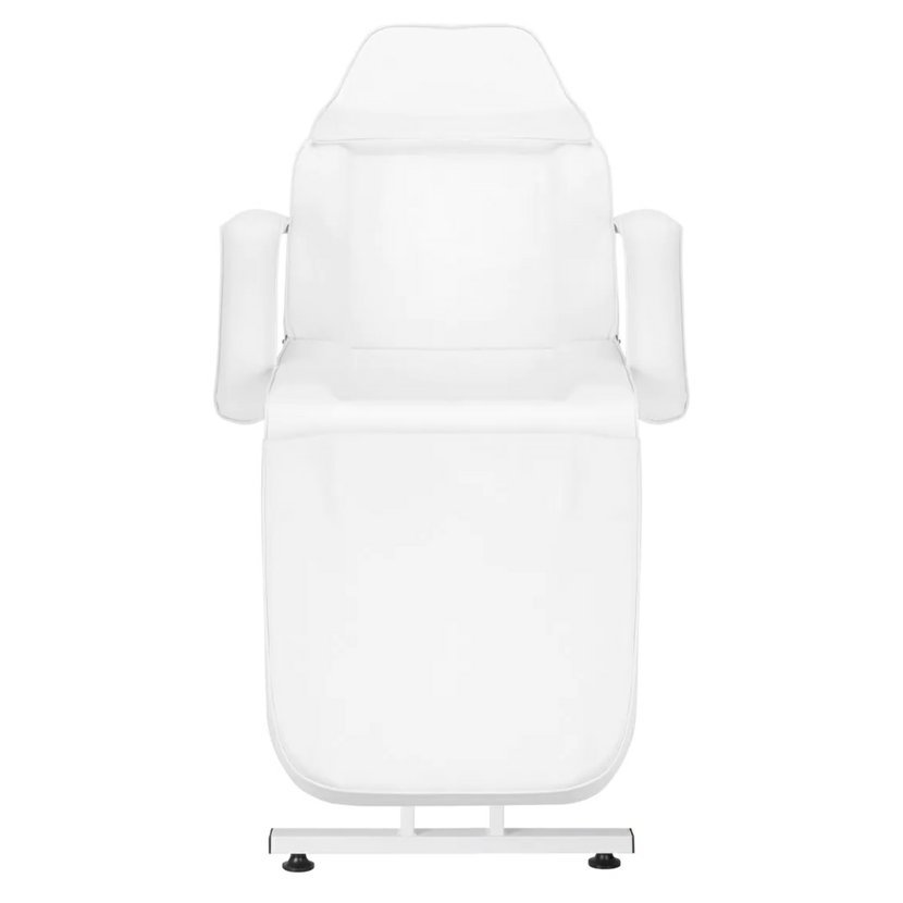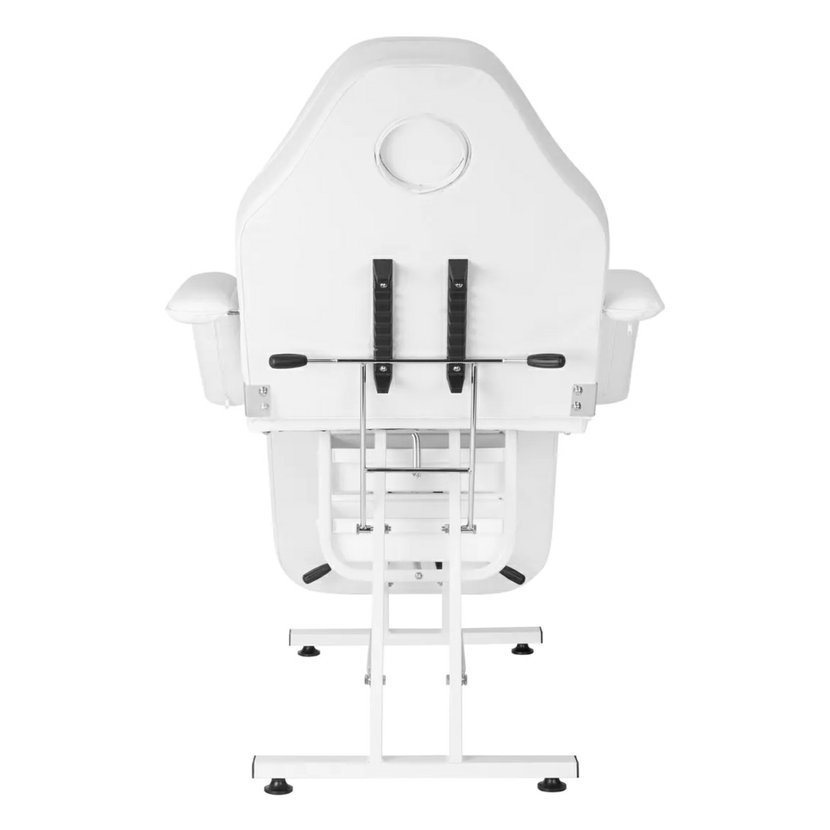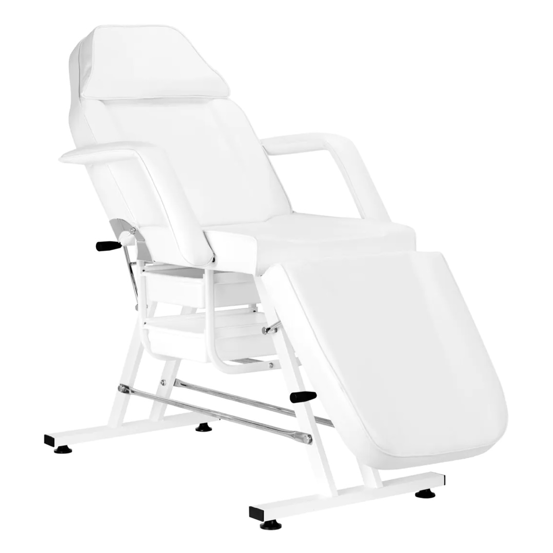 Bílé kosmetické křeslo Sillon se dvěma zásuvkami, které jsou instalované pod sedadlem. Díky otvoru v opěrce hlavy, který je skrytý pod správně profilovaným polštářem, je křeslo ideální pro ošetření obličeje i zad. Stabilní područky poskytují uživateli dostatečnou oporu. Tyto prvky dělené napůl jsou pohyblivé, takže dobře padnou při změně polohy zádové opěrky a lze je také snadno vyjmout. Postupné nastavení úhlů podnožky a zádové opěrky zajišťuje speciální mechanismus. Pomocí ruční páky můžete plynule nastavit polohu sedadla. Křeslo lze sklopit do polohy gauče. Základna židle má konstantní výšku, takže sedák je na konstantní úrovni. Pevný kovový rám v odstínech bílé a protiskluzové nožky, které zabraňují nekontrolovanému pohybu zařízení, poskytují potřebnou stabilitu při používání. Křeslo je vyplněno molitanem a potaženo imitací kůže v odstínech bílé.