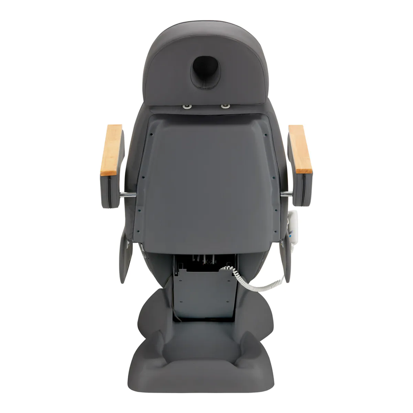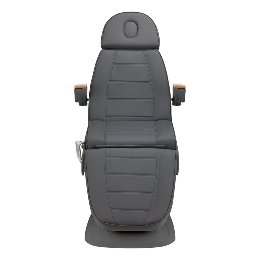 Křeslo je vyplněno pěnou odpovídající tvrdosti a potaženo na dotek příjemnou imitací kůže v odstínech šedé. Díky použití materiálu, který se snadno udržuje v čistotě a je odolný vůči vybraným dezinfekčním prostředkům, se zařízení pohodlně používá , je odolné proti vlhkosti a snadno se čistí. Pevná základna z odolného materiálu v odstínech šedé zajišťuje stabilitu při ošetření. Ozdobné dřevěné prvky na područkách odlišují křeslo od ostatních modelů a vytvářejí vizuálně atraktivní a elegantní akcent . Správně profilované lemy dodávají židli stylový vzhled a dělají sedák ergonomickým .